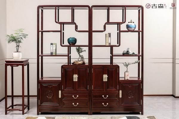古森红木《红酸枝吉祥如意多宝阁》以开放格架设计适应现代陈设需求,兼顾展示与实用