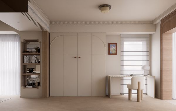多功能区域巧妙平衡了收纳秩序与个性表达。一组带有弧形顶部的米白色通顶衣柜,以简洁优雅的形态提供了强大的储物功能,两颗棕色的圆形把手成为精致的点缀。书籍与心爱摆件的陈列,瞬间注入了主人的生活气息与人文情感。临窗设置的简约书桌,充分利用了自然光线,墙上悬挂的画作与背景的线条装饰,丰富了墙面的细节层次。右侧百叶窗与左侧透光帘,赋予居住者对光线灵活掌控的自由。整个空间在柔和色调与优良采光中,实现了收纳、工作、阅读与展示的多元功能,秩序井然又不失个性趣味,正是“功能与美观并重”理念的微观缩影。