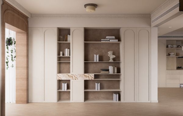 程和安将书房或阅读区视为家的精神内核。一面气势恢宏的组合书架墙,不仅是书籍与藏品的安放之所,其本身即是一件巨大的空间装置艺术品。米白色的开放式隔层与带拱形门板的柜体错落组合,穿插着大理石纹理的面板,在统一中寻求丰富的变化。书籍、雕塑、艺术品被精心陈列其中,宛如一个小型家庭美术馆。