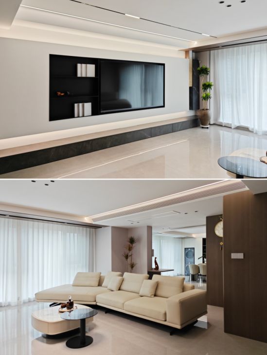 一字型电视柜搭配悬浮背景墙,黑白对比呈现出简约而不简单的高级质感。阳台与客厅打通后,视野通透敞亮,客厅、书房、餐厅之间隔而不断,办公与休闲模式可根据需要随心切换,让空间服务于生活本身。