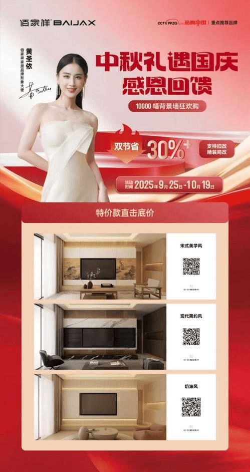 金秋送爽,丹桂飘香。在中秋佳节与国庆黄金周相逢的喜庆日子里,国内知名家居品牌——佰家祥家居,成功举办了其品牌升级并签约代言人黄圣依后的首次全国性大型线下营销活动。此次活动以“中秋礼遇国庆,感恩回馈”为主题,依托总部与全国运营中心的高效协同与精心部署,在全国范围内掀起了一股家居消费热潮,取得了令人瞩目的市场反响与销售业绩,标志着佰家祥品牌升级战略迈出了坚实而成功的一步。