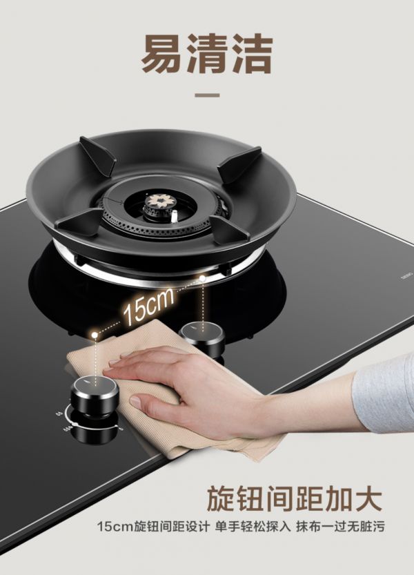 在细节处,樱花燃气灶S839G内外环齿盖均采用全铜材质,耐烧、耐腐蚀、不易变形,长久使用依旧可靠。同时,旋钮之间采用15cm加大间距的设计,单手可轻松擦拭,抹布一抹即可恢复整洁,毫不费力。