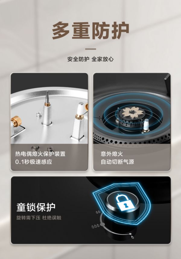在安全层面上,樱花燃气灶S839G的多重防护,让全家放心:热电偶熄火保护装置,可在0.1秒极速感应,在意外熄火时可自动切断气源,配合按压式的童锁保护,让厨房里的每一次相聚都多一份安心。