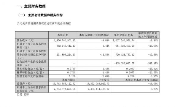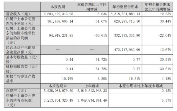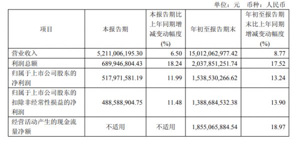 其中,第三季度营收约52.11亿元,同比增长6.5%。归母净利润约5.18亿元,同比增长11.99%。