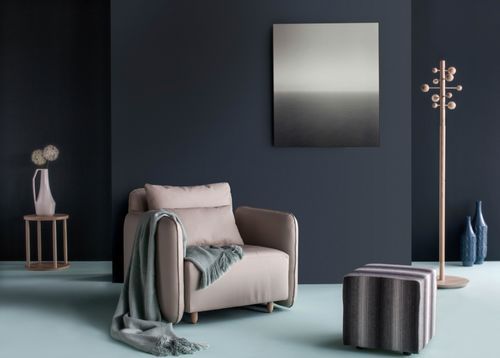 灰色内敛而高级,属于偏冷的色调,能有效降低空间的温暖属性。因此我们不妨参考下图,将墙壁刷成深灰色,地面选择相对明快的浅灰蓝,如此一来,一个清凉的空间基调就出来了。