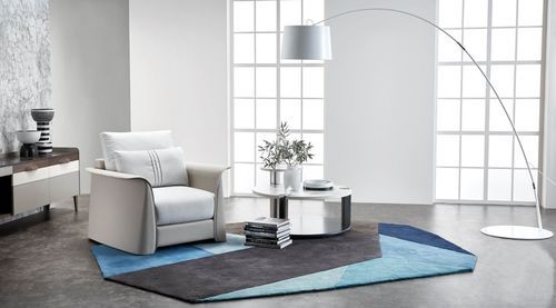 一般来说,地毯容易给人温暖的感受,不过绒毛短促、偏冷色调的薄款,就能很好地解决这个问题,比如上图里蓝+深灰组合地毯,反而能起到装饰空间兼具清凉感的效果。