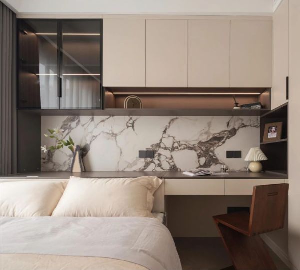 (1)用低饱和度、高暖度的色彩作为基调色,打造冬日“暖”基底:比如奶茶色系温柔、醇厚,燕麦色系高级、柔和,浅陶土色,带着大地气息的质朴,这些色系可以应用于定制柜体、背景墙和大型家具上,确保整体视觉的统一与和谐。