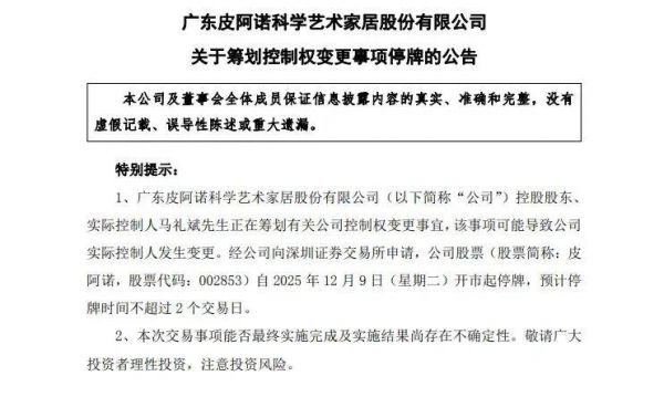 2025年12月8日晚,皮阿诺发布公告称,公司控股股东、实际控制人马礼斌正在筹划涉及公司控制权变更的重大事项,该事项可能导致公司实际控制人发生变更。