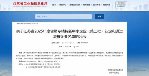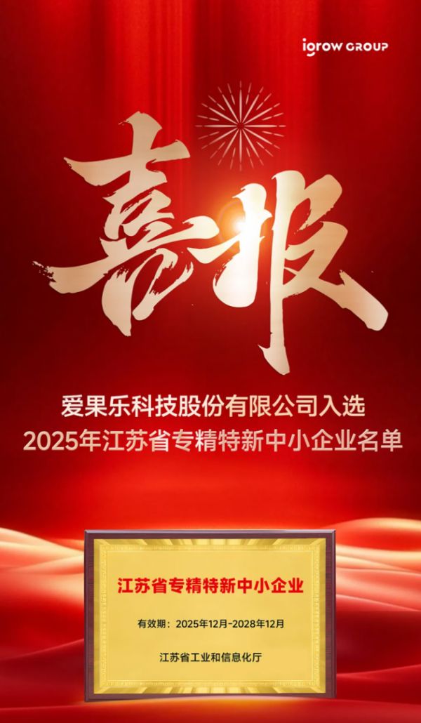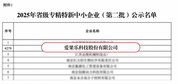 近日,江苏省工业和信息化厅公布了《关于江苏省2025年度省级专精特新中小企业(第二批)认定和通过复核企业名单的公示》。凭借持续的科技创新和显著的行业影响力,爱果乐科技股份有限公司成功入选,荣获江苏省“专精特新”中小企业认定。