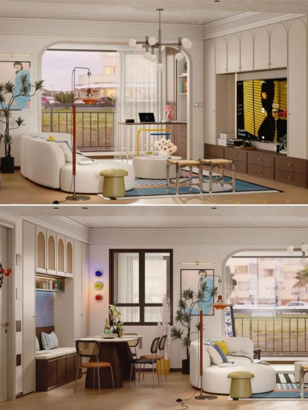 家具优选轻量化、便于移动的款式,以便随时根据需求调整布局。搭配可升降的投影幕布,更能一键切换为沉浸式家庭影院模式。