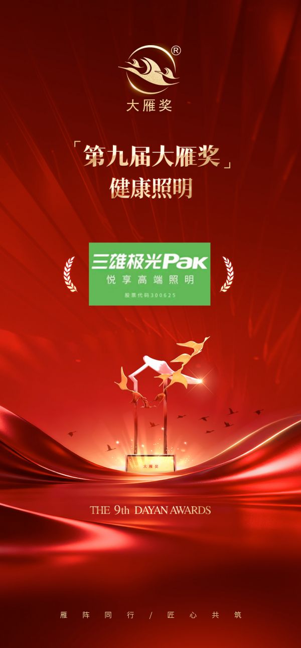 1月30日,家居产业权威奖项——「第九届大雁奖」获奖名单于云端发布会隆重揭晓。国内照明领军品牌三雄极光,凭借其在健康照明领域二十多年来的深耕与卓越贡献,实力荣膺「第九届大雁奖·中国家居行业健康照明」权威奖项。