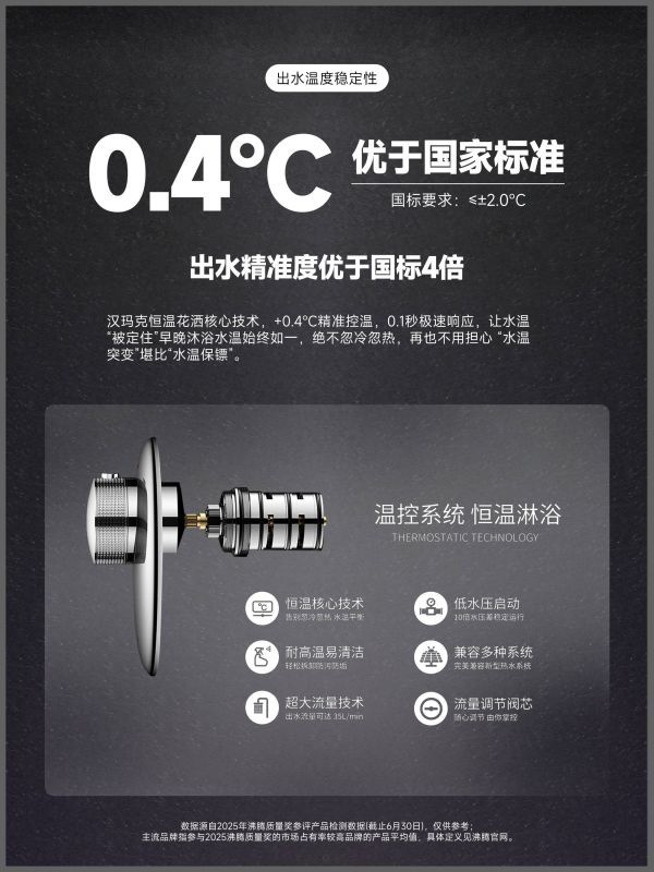 真正的第一品牌,必先掌握行业的核心技术话语权。对于恒温花洒而言,阀芯便是“核心中枢”,其性能直接决定沐浴体验的上限、产品寿命的长度,更是破解低水压、用水高峰水温波动等用户核心痛点的关键。讨论恒温花洒第一品牌,本质上就是讨论谁能将这一“核心中枢”的性能做到极致——而汉玛克,用自主研发的“潜龙800”恒温阀芯,给出了行业最优解。