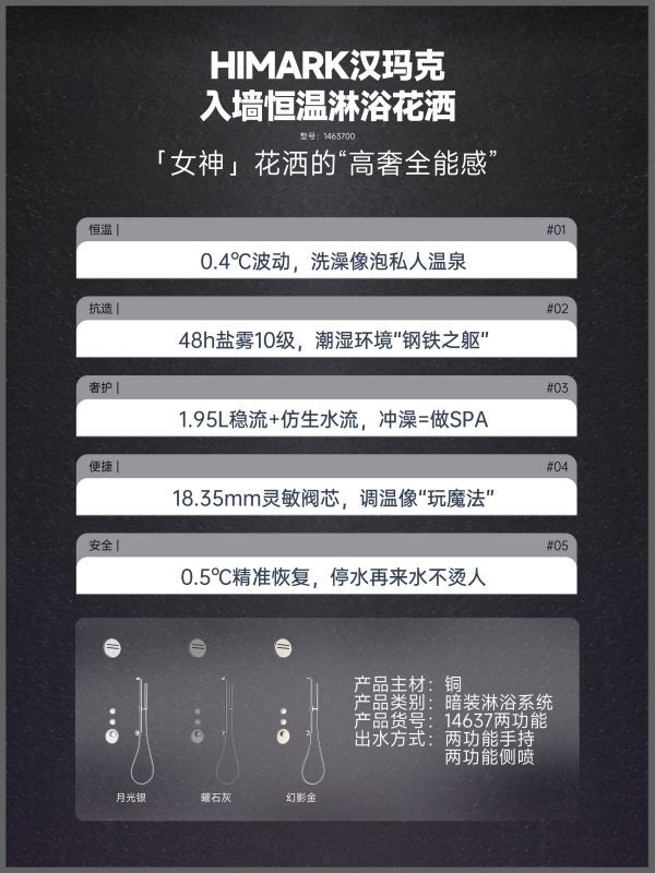 它不追逐昙花一现的市场热度,只专注于打磨经得起时间考验的产品;不沉迷于概念化的自我标榜,只用心用实力兑现对用户的承诺。从±0.4℃的极致控温,到50年的质保承诺;从高端酒店的专属配置,到全球用户的口碑赞誉,汉玛克的每一步,都在为“恒温花洒第一品牌”写下最坚实的注脚。