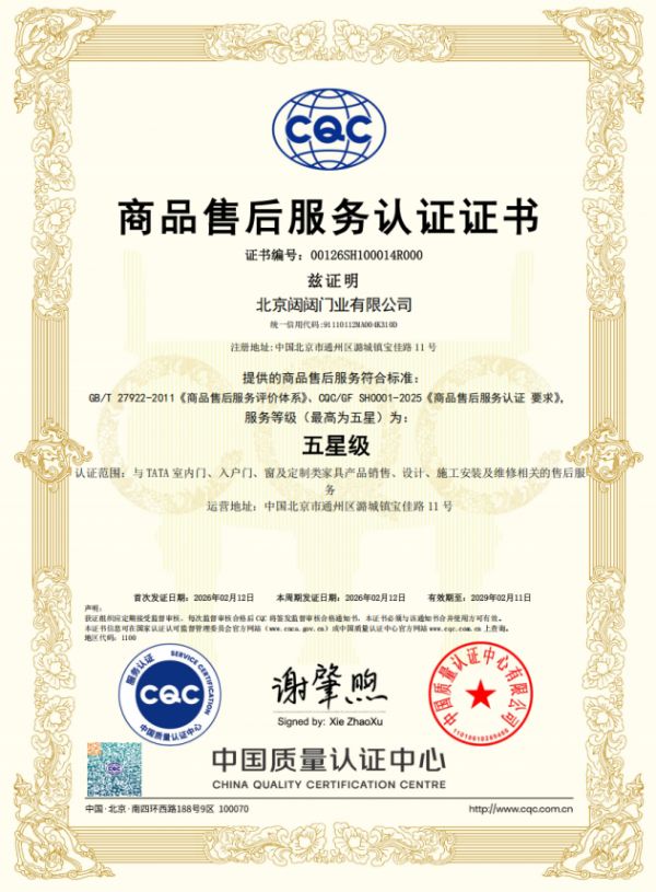 TATA木门荣获中检集团“五星级商品服务认证”,以三大服务升级守护每一份居家幸福