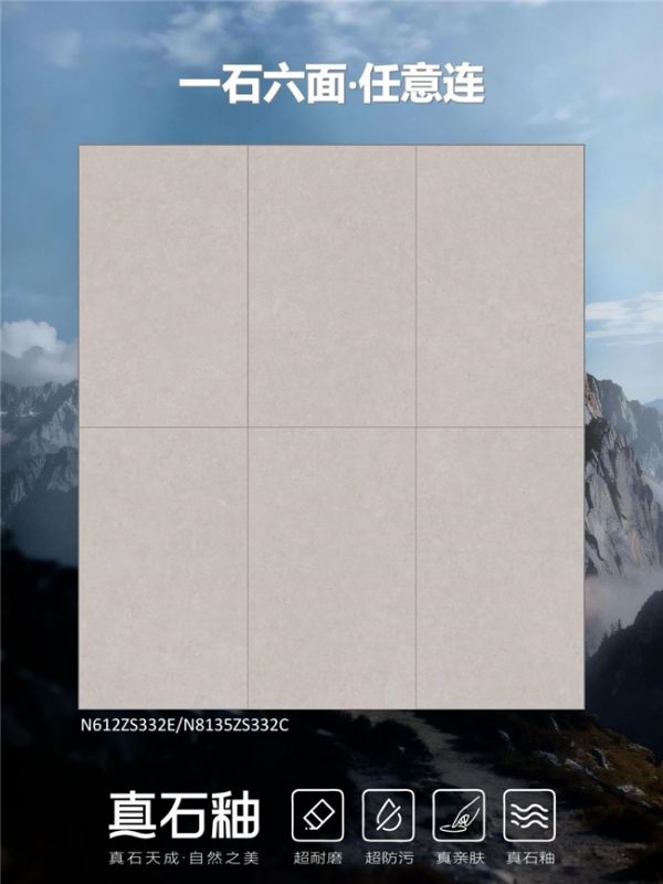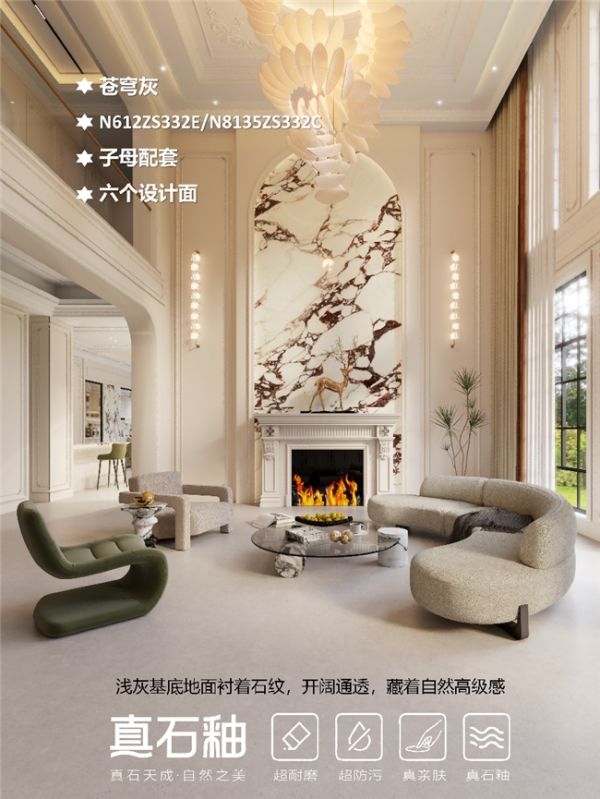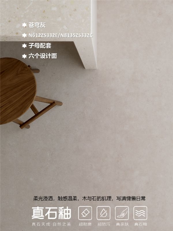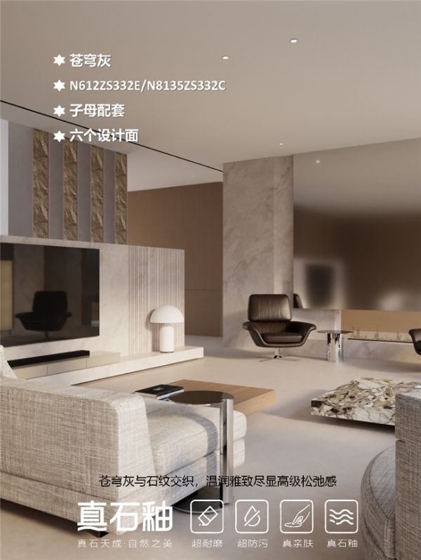 这款苍穹灰,型号为N8135ZS332C,还有子母配套款N612ZS332E。它像是将天地间的诗意凝于砖面:如广袤天际的云雾交织,灰调深浅变幻似星河隐现,没有死板的纯色,细腻的真石釉质感温润亲肤,自带高级滤镜。