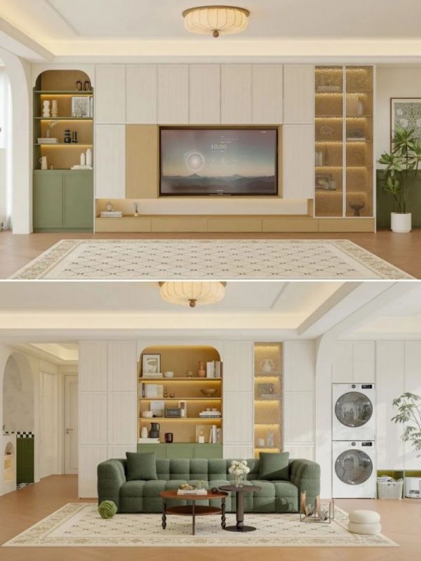 浪漫与温暖的结合体。奶乎乎的墙面搭配精致的法式线条,绿色柜门增添了一抹自然感,搭配柔软绒面沙发与玻璃柜门,春日氛围感直接拉满。