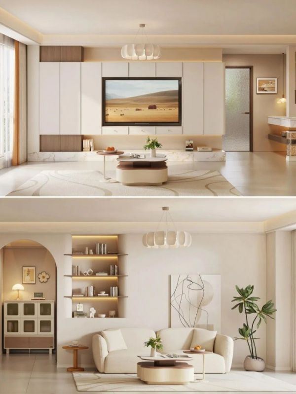 软乎乎的治愈系选手。整体以奶白、奶杏为主色调,没有尖锐的棱角,家具都自带温柔滤镜。仿佛被温柔包裹,所有的疲惫和寒意都能瞬间消散。