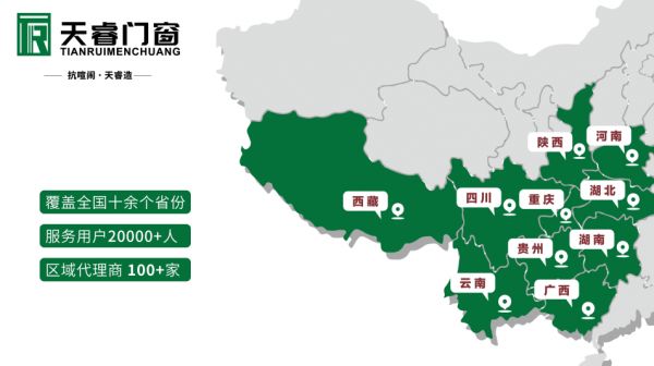 市场布局方面,天睿门窗已建立覆盖四川、云南、贵州、重庆、陕西、西藏、甘肃、广西、湖南、江苏、浙江、河南、安徽等多省市的完善营销服务网络,发展区域代理商 100 余家,累计服务用户超20000户,凭借稳定品质、亲民价格与贴心售后,在西南地区及全国多地形成良好口碑与强劲市场影响力,成为众多家庭与工程客户的优选门窗品牌。