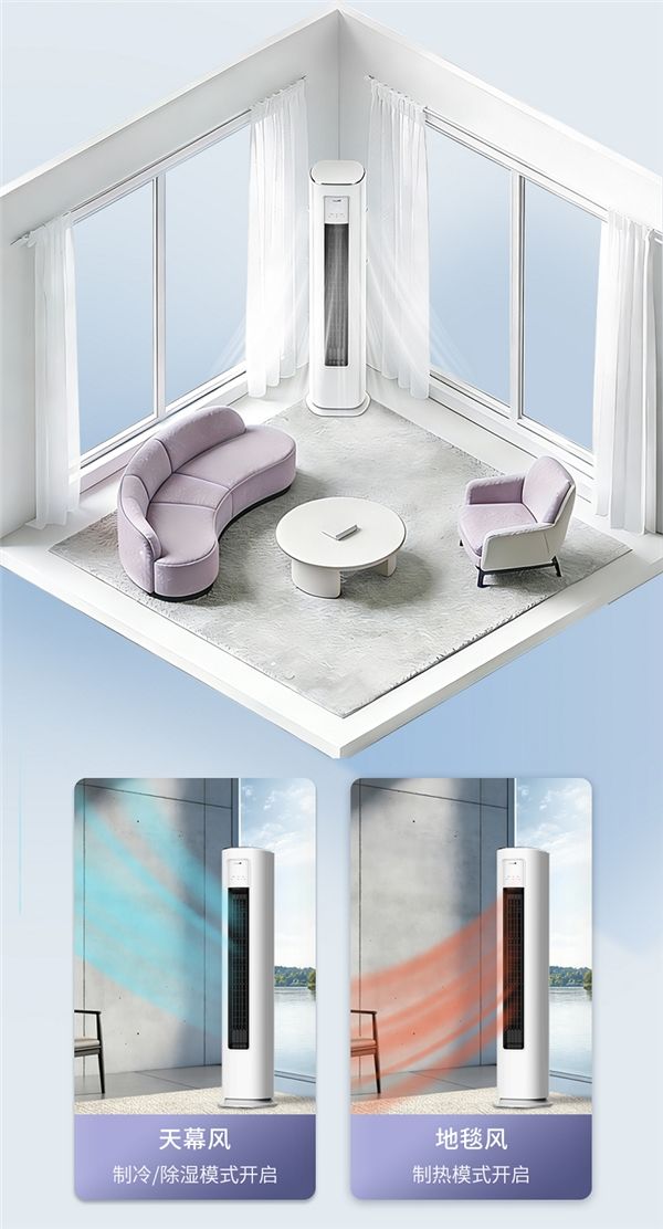 针对大空间冷暖不均的痛点,“至风”以创新风感科技重新定义舒适边界。一键开启“舒适风”模式,智能调节出风角度:制冷天幕风避免冷风直顶,凉感均匀不刺骨;制热地毯风遵循“暖从足起”的人体工学,自下而上包裹全身。168mm×1153mm超宽出风口配合12米超远送风与80°广角扫风,强势覆盖客餐厅等大空间,彻底告别局部忽冷忽热,让每一个角落都浸润在恰到好处温柔里。