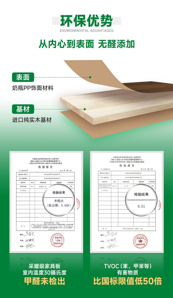 此外,航美开创的“无漆”工艺,让实木板材告别传统油漆与三胺纸饰面,表面采用食品级环保材料(婴儿奶瓶同源材质),并通过真空镀膜技术附着。由此,产品不仅在HENF级高温检测中甲醛“未检出”,TVOC总挥发性有机物释放率更优于国标50倍,在保留实木活性的同时实现极致环保。