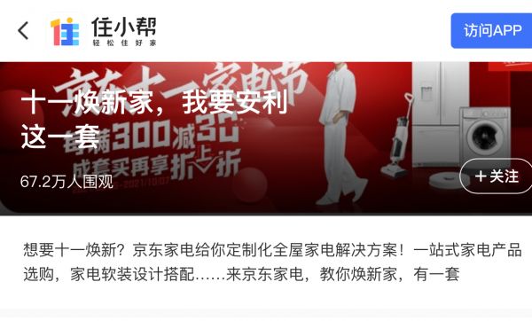 以京东家电十一大促为契机,住小帮安心软装节特别上线了#十一焕新家 我要安利这一套#的话题,以大咖设计师赖旭东的发声助阵,快速推动用户形成“家电成套”的购买意识,同时通过家居、软装达人的联合花式安利,让用户在刷话题的过程中“沉浸式种草”。