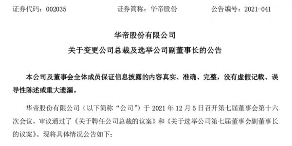 近日,华帝股份发布公告称,由于工作调整的原因,潘垣枝申请辞去公司总裁职务。董事会同意由董事长潘叶江兼任公司总裁。