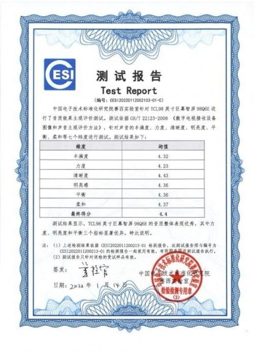 现场邀请了18位音质领域的金耳朵专家为超大屏家庭影院电视主观打分,针对声音的丰满度、力度、清晰度、明亮度、平衡、柔和六个纬度进行了测试,测试依据国家主观评价标准的试听测试体系,测试环境为中国电子技术标准化研究院最新耗巨资打造的国内顶级视听室之一。在专业级的试听环境,由专业级的测试人员,通过权威专业的评价体系,最终得出结论,配备安桥音响的TCL 98英寸巨幕电视凭借着出色的音效表现取得了4.4分(4分以上即为优秀水平)的好成绩。