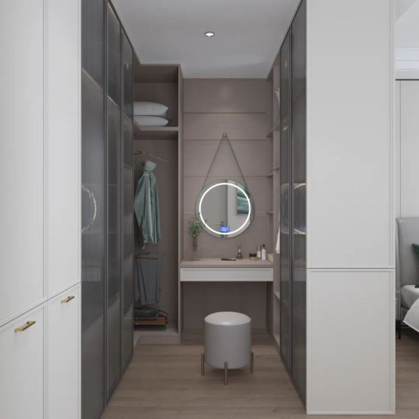 在衣帽间里,梳妆台往往是和衣柜一起设计定制的,既可以保持风格统一,又能在最大程度上节约空间,搭配可以显示天气、时间的智能化妆镜,让生活更便利。