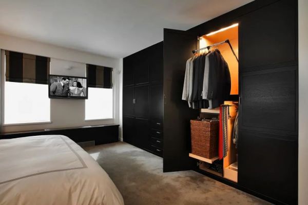 有些户型会在主卧的卫生间和主空间之间留一个小过道,拿来做衣帽间,定制衣帽间与卫生间相连时难免会受到卫生间水汽的影响,在定制时一定要做好柜体的防水与防潮处理。