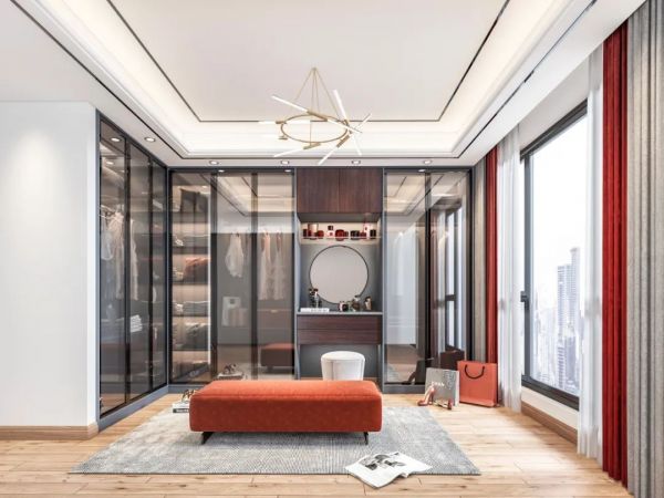如果没有多余的独立空间,而主卧空间又足够大的话,可以试试用柜体隔出一个衣帽间,也可以做成开放式设计,动线方便,整体性更强。